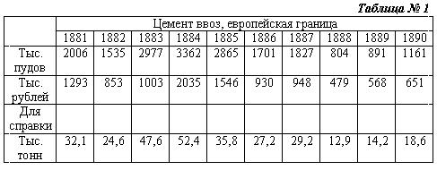 Из таблицы видно, что в 1881-1885 годы ввоз цемента в Россию из-за границы увеличился с 2006 тыс. пудов до 3262 тыс. в 1884 г., т.е. возрос на 61%.