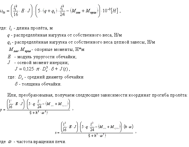 Таким образом, исходя из полученных зависимостей координат прогиба пролёта, можно сделать вывод, что их величины обратно пропорциональны осевому моменту инерции, который непостоянен во времени. Это обусловлено тем, что, во-первых: обжигаемый материал находится в постоянном движении при вращении цементной печи; а во-вторых: непостоянством величины осевого момента инерции сечения пролёта, которое проявляется в связи с неравномерностью укладки футеровочного слоя, а так же возможностью того, что этот слой может местами обсыпаться из-за высоких температур внутри печи. Снижения влияния прогибов печи можно добиться несколькими способами: изменением рабочих характеристик встраиваемого станка и постоянным контролем прогибов оси печи с последующим своевременным нивелированием.