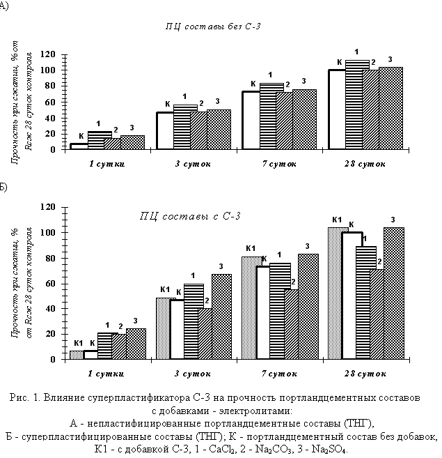Наибольший прирост прочности обеспечивает в непластифицированных портландцементах CaCl2, а такие добавки, как Na2CO3 и Na2SO4 существенно уступают ему. (рис. 1 А).