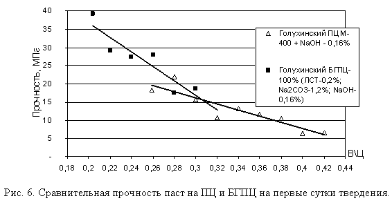 Попытки получения высокопрочных материалов из безгипсовых ПЦ при повышенных В/Ц обречены на неудачу (рис. 6) из-за отсутствия обеспечивающего армирование эттрингита.